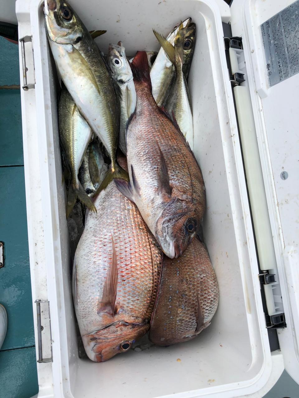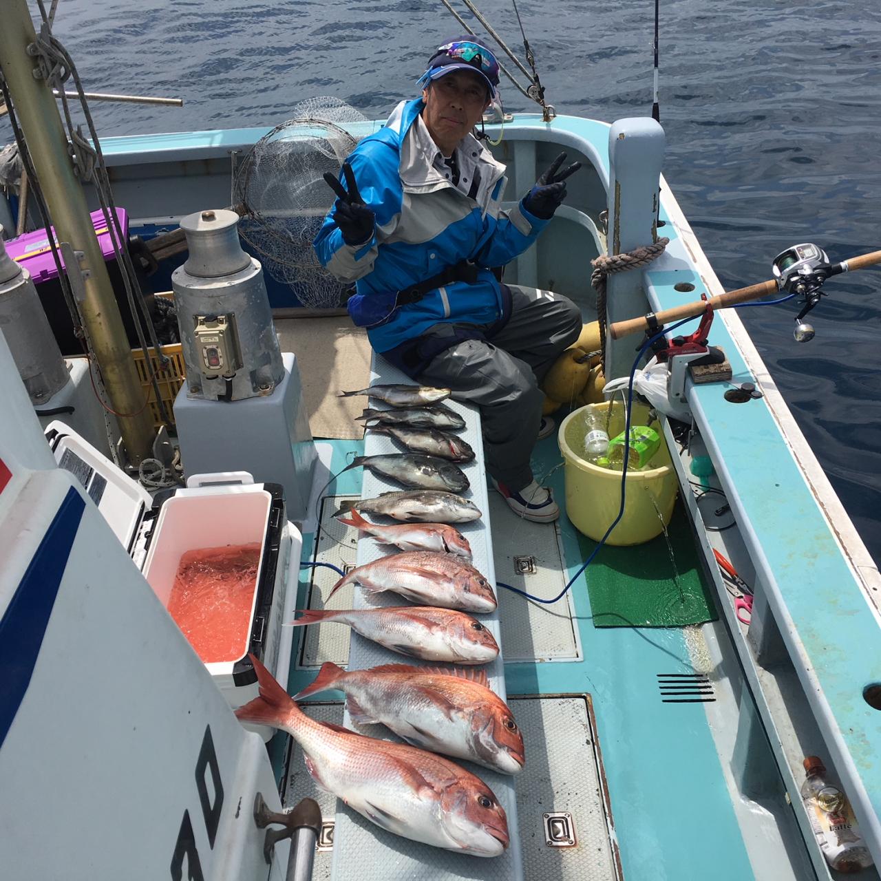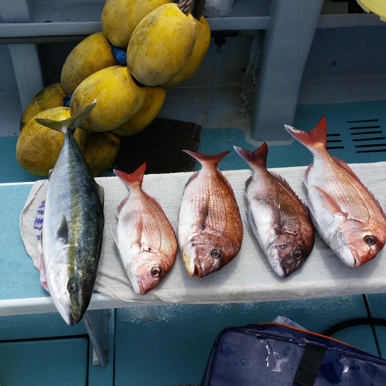 今日は真鯛五目に出船、真鯛全員ゲット、黒鯛、メジナ交じる。今日はどうもありがとうございました。iPhoneから送信