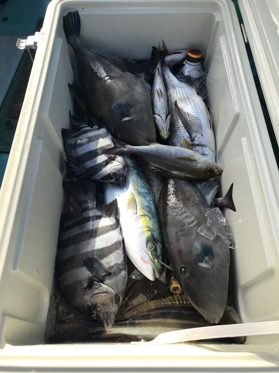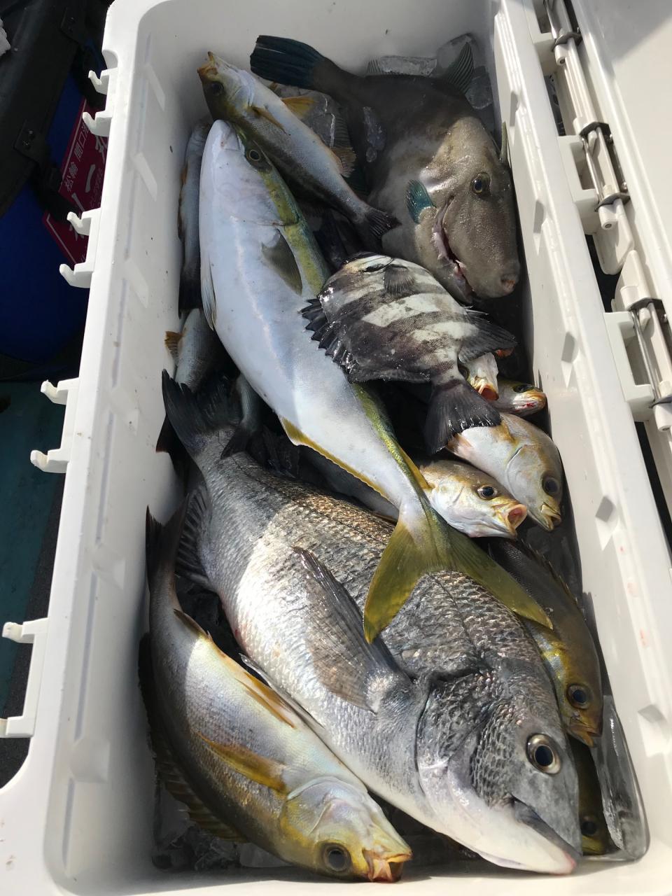 シャクリ五目に真鯛、石鯛、黒鯛、イナダ、イサキ、メジナ、鯵、カワハギ、ウマズラハギ交じる。みなさん今日はどうもありがとうございます。iPhoneから送信